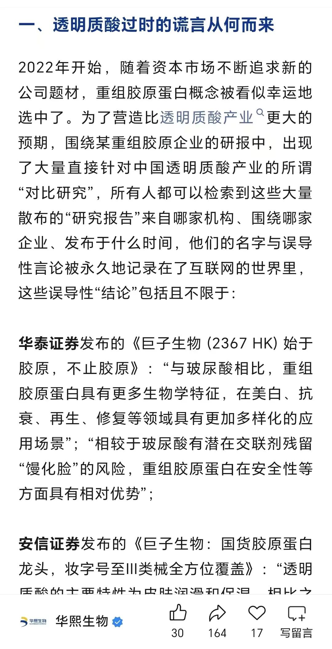 文章称,2022年开始,随着资本市场不断追求新的公司题材,重组胶原蛋白概念被看似幸运地选中了。为了营造比透明质酸产业更大的预期,围绕某重组胶原企业的研报中,出现了大量直接针对中国透明质酸产业的所谓“对比研究”,所有人都可以检索到这些大量散布的“研究报告”来自哪家机构、围绕哪家企业、发布于什么时间,他们的名字与误导性言论被永久地记录在了互联网的世界里,这些误导性“结论”包括且不限于华泰证券发布的《巨子生物 (2367 HK) 始于胶原,不止胶原》等。